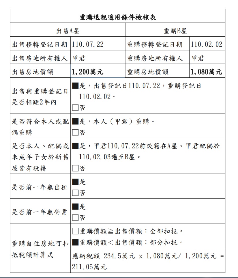 該局舉例並以檢核表說明,甲君於106年11月以500萬元買進A屋並設籍居住,110年7月以1,200萬元出售,因持有期間為3年8個月故適用稅率為35%,應納房地合一稅為234.5萬元〔(成交價額1,200萬元-可減除成本500萬元-可減除移轉費用上限30萬元)×35%〕;甲君於出售A屋前已先於110年2月以1,080萬元買進B屋,且甲君配偶設籍在B屋,因甲君出售A屋與重購B屋期間在2年以內,且都設籍居住,兩屋均無出租、供營業或執行業務使用,甲君於申報出售A屋之房地合一稅時,可申請適用重購自住房地扣抵稅額211.05萬元〔應納稅額234.5萬元×(重購價額1,080萬元÷出售價額1,200萬元)〕,只須繳納稅額23.45萬元。(檢核表說明如附件所示)